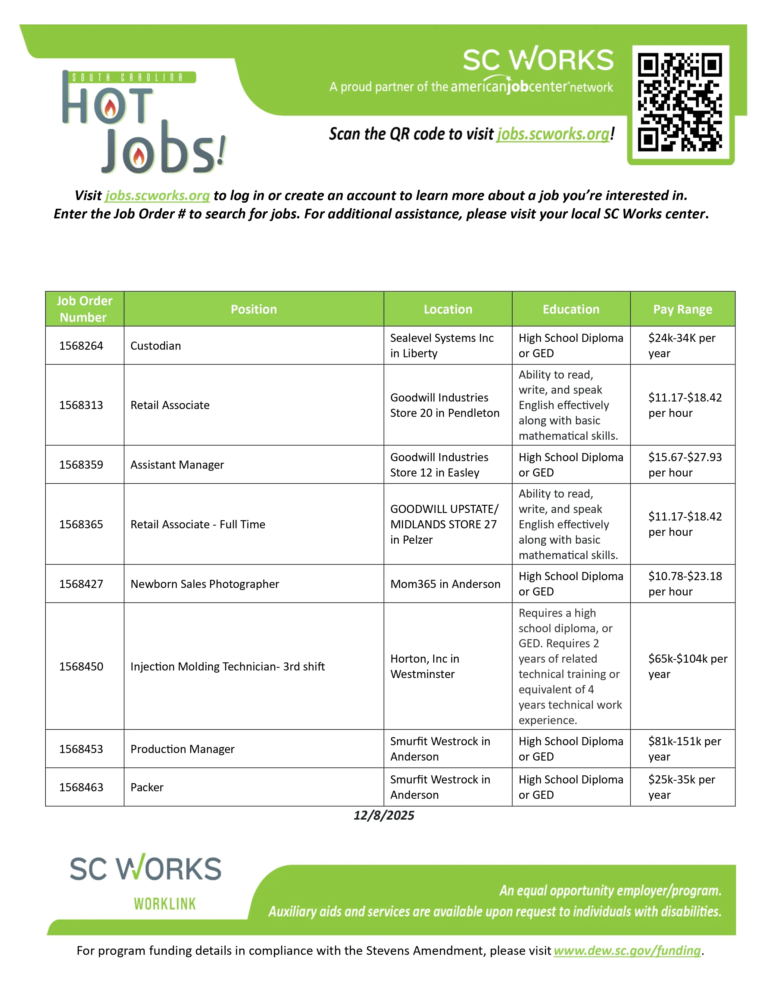 Looking for your next opportunity? Check out these current hot jobs from SC Works! Scan the QR code or visit jobs.scworks.org to log in or create an account and learn more about positions youβre interested in.